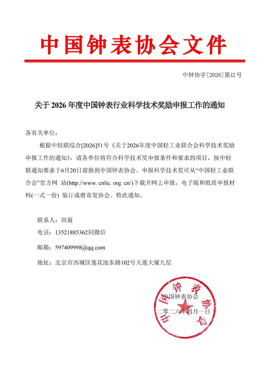 关于2026年度中国钟表行业科学技术奖励申报工作的通知